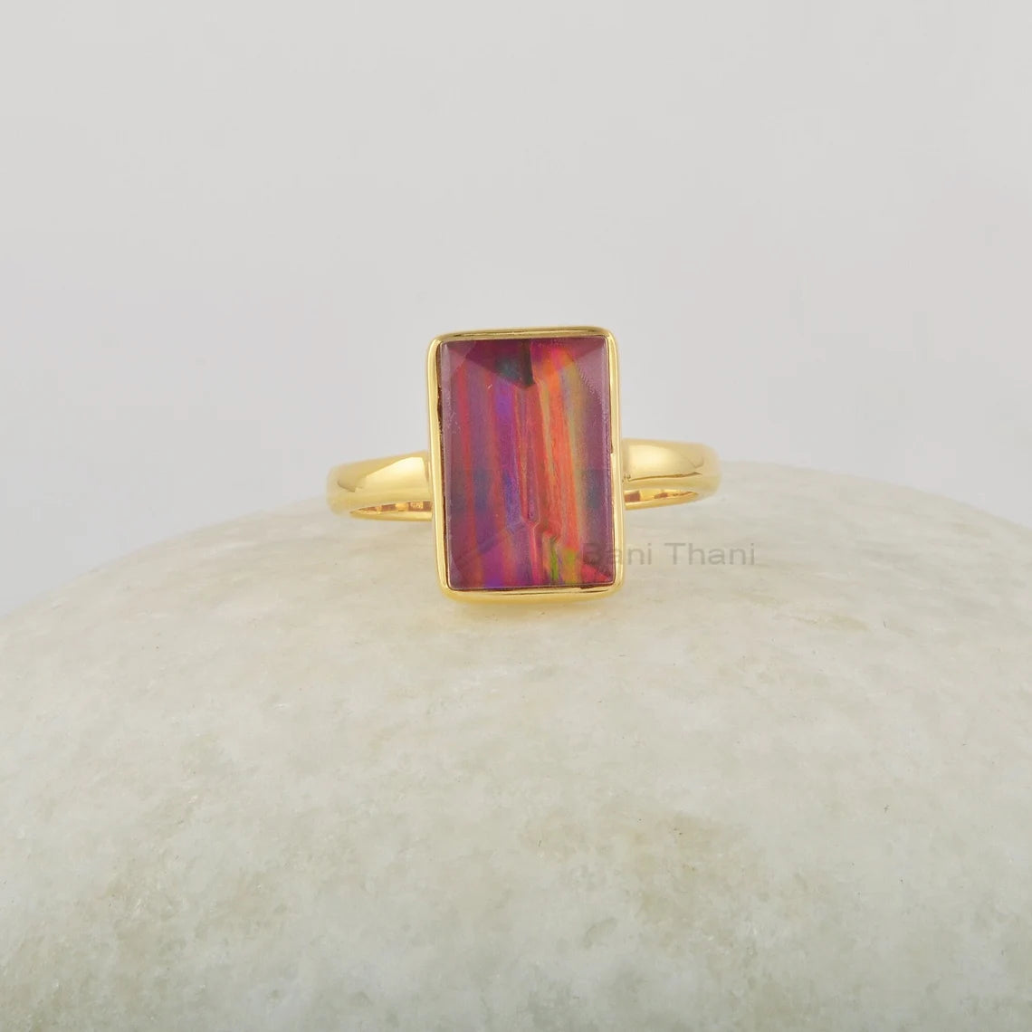 Red Opal Ring, Aurora Opal Ring, 8x12mm Rectangular pyramid Gemstone Solid Silver Ring For Women, 18k Gold Plated Silver Ring, Gift For Her