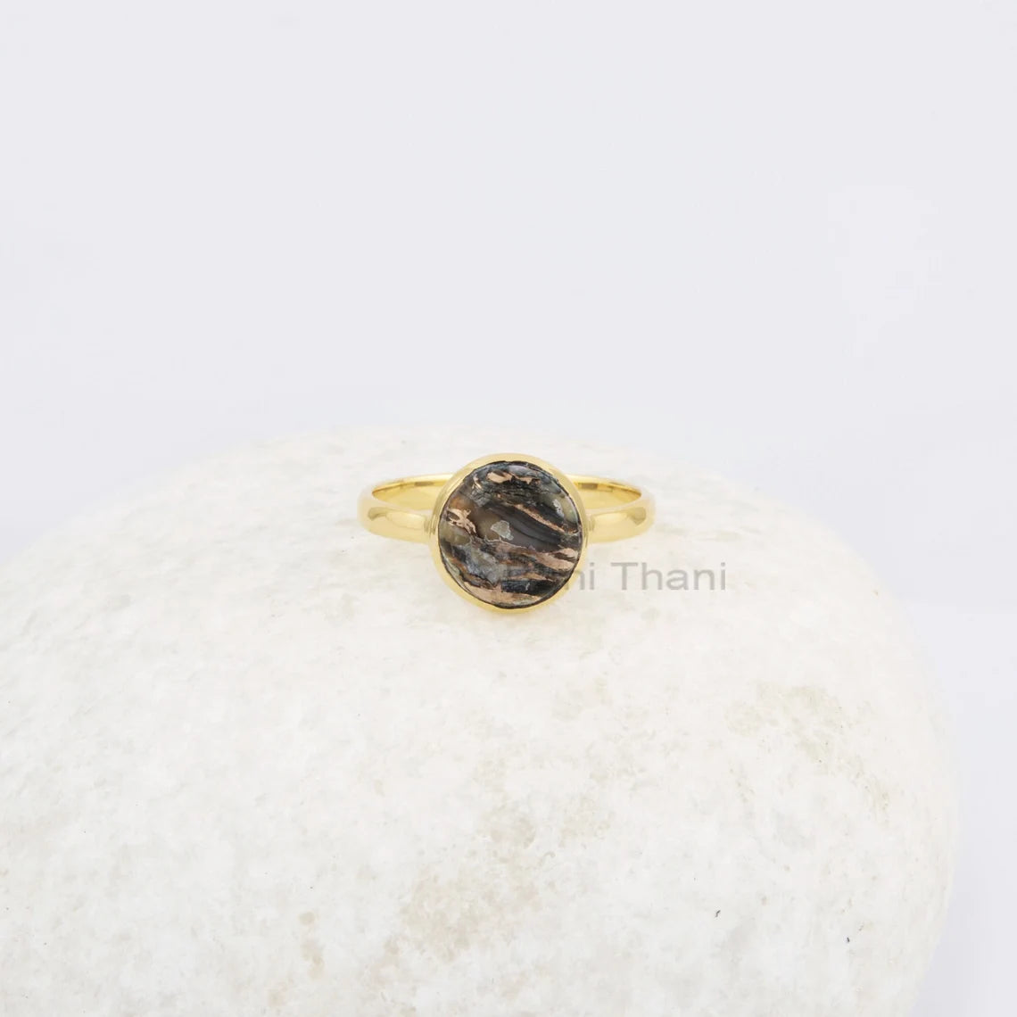 Round Shell Ring, 10 MM Black Copper Shell Gemstone Ring, 18k Gold Plated Sterling Silver Ring, Bezel Ring For Womens, Anniversary Gift Ring