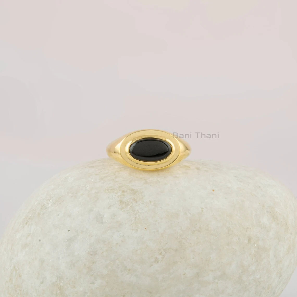 Signet Ring - Gift for Her - Black Onyx Gemstone Ring - 6x11mm Oval Ring - Gold Plated Ring - 925 Solid Silver - Birthday Gift - Dainty Ring