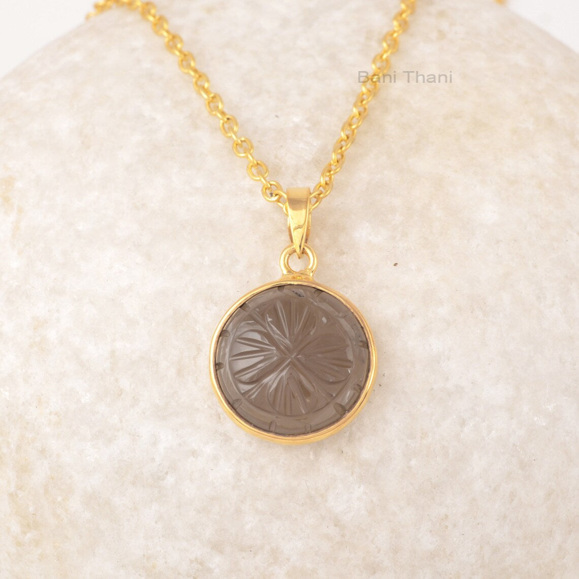 Smoky Quartz Round Silver Pendant Necklace, 15mm Round Engraved Gemstone Gold Necklace, 925 Silver Gold Plated Necklace For Gifts