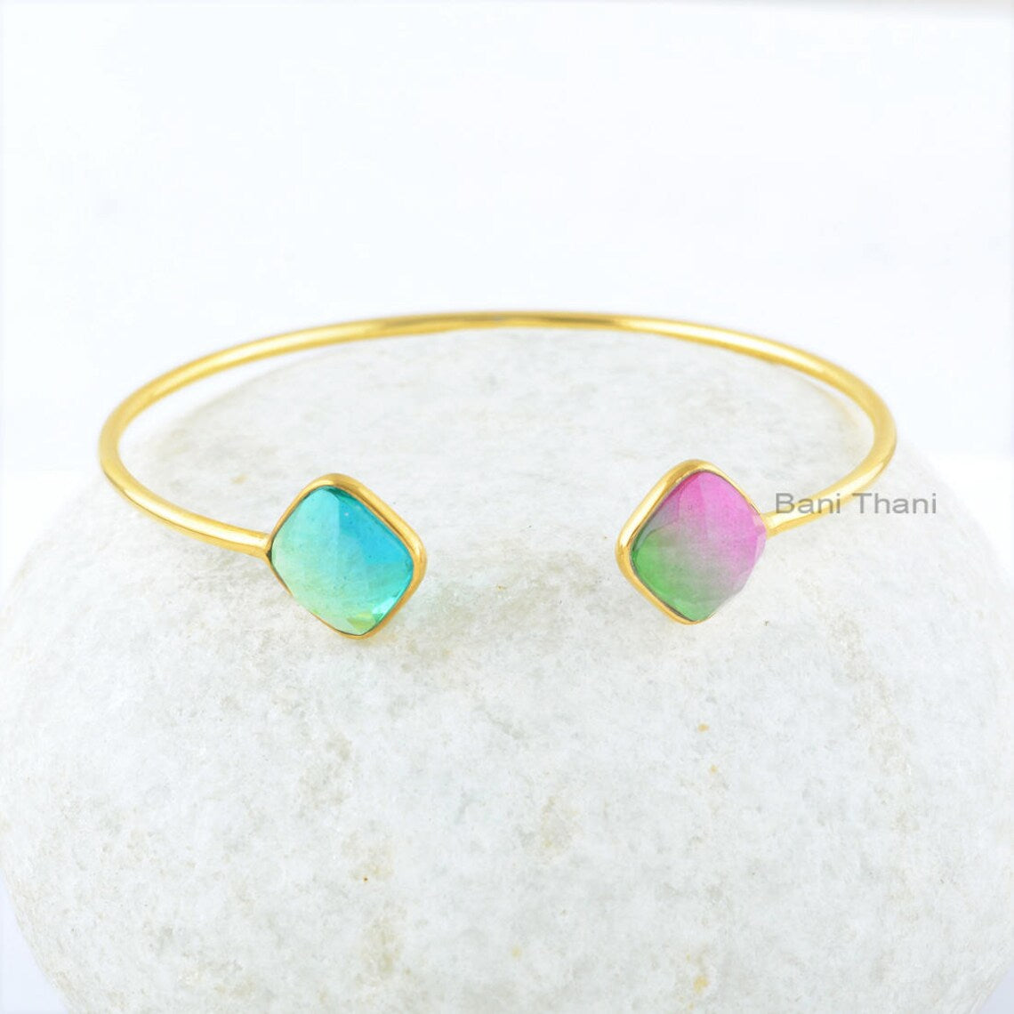 Tourmaline Quartz Bangle-Tourmaline Quartz 10mm Cushion Gemstone Bangle-18k Gold Plated Sterling Silver Bangle-Gift for Mother-Birthday Gift