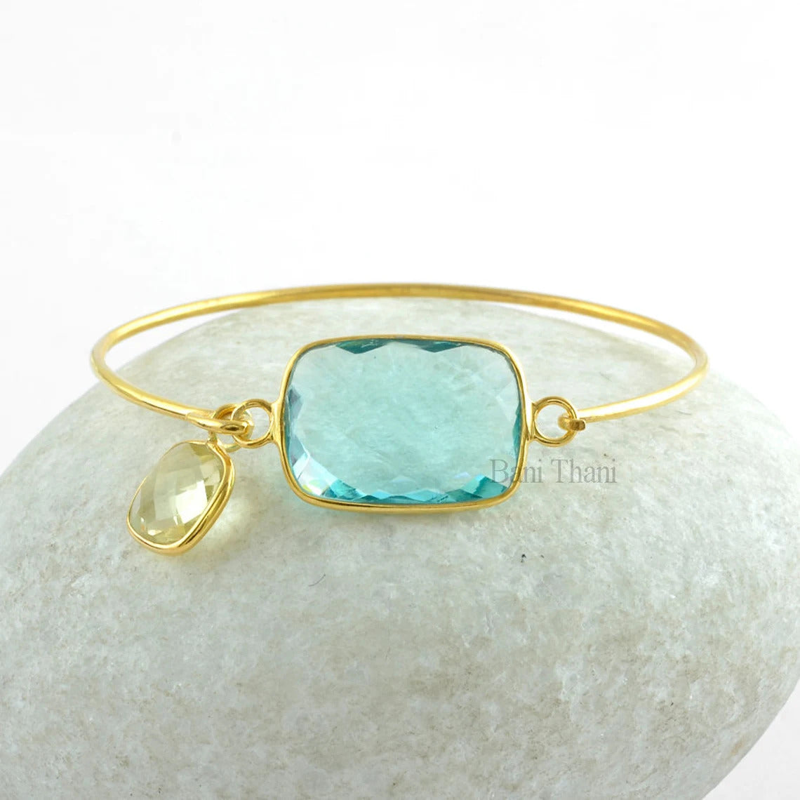 Stunning Aqua Quartz 15x22mm Rectangle With Crystal Quartz Charm 10mm Cushion Gemstone Bracelet- 18k Gold Plated 925 Sterling Silver Bangle