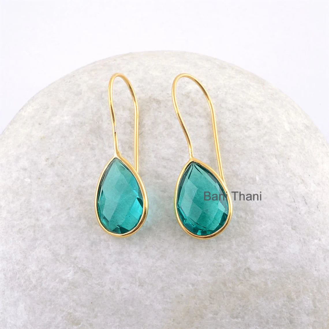 Teal Quartz Faceted Pear 10x15mm Gemstone Drop Earrings, Gold Plated 925 Sterling Silver Dangle Earrings, Hook Earrings, Womens Gift Earring