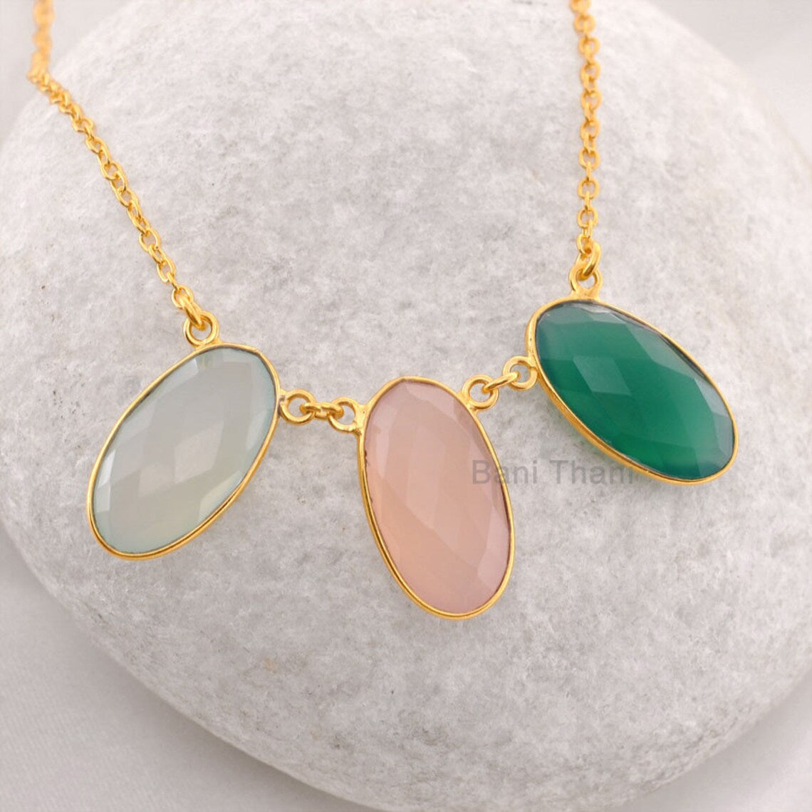 Three Stone Necklace, Aqua, Pink Chalcedony, and Green Onyx Oval Necklace, Gold Plated 925 Sterling Silver Bezel Necklace, 13x18mm