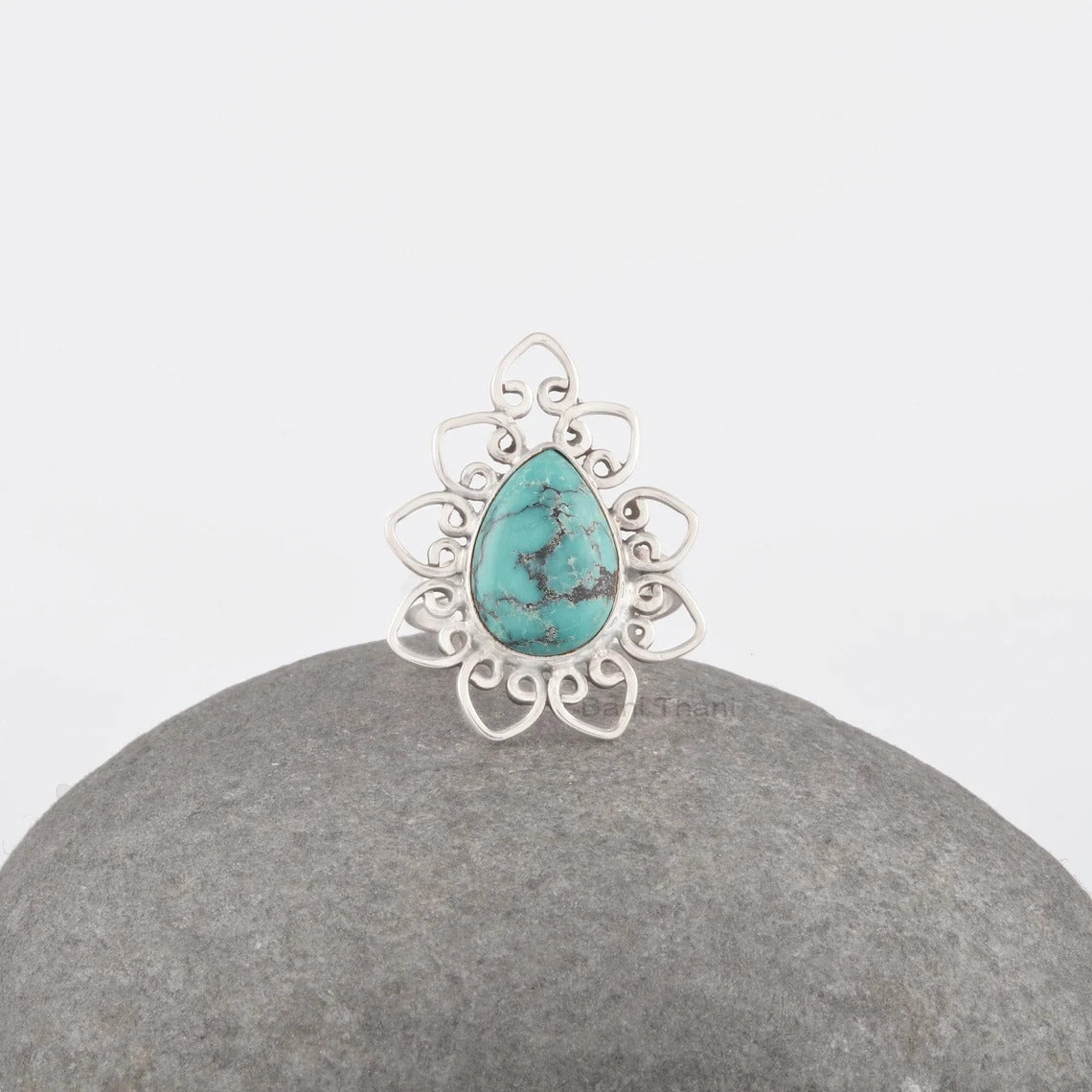 Tibetan Turquoise Gemstone Ring, Solid Silver Ring, 9x13mm Pear Shape Turquoise Ring, Filigree Ring, Boho Ring, Anniversary Gift For Women