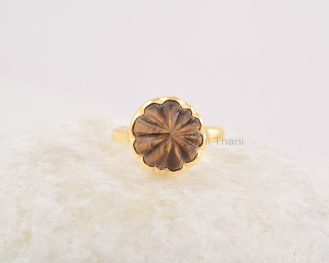 Tiger Eye Gemstone Silver Ring - Round Carved Ring - 925 Sterling Silver Ring - Zig Zag Ring - Gift for Her - Ring for Women - Dainty Ring