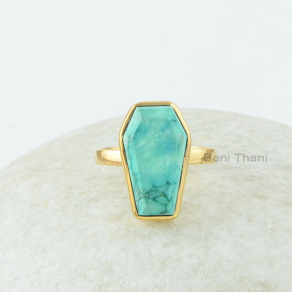 Turquoise Gem Ring, Turquoise 10x17mm Coffin Gemstone Ring, 18k Gold Plated Bezel Set Ring, 925 Sterling Silver Coffin Shape Ring For Women