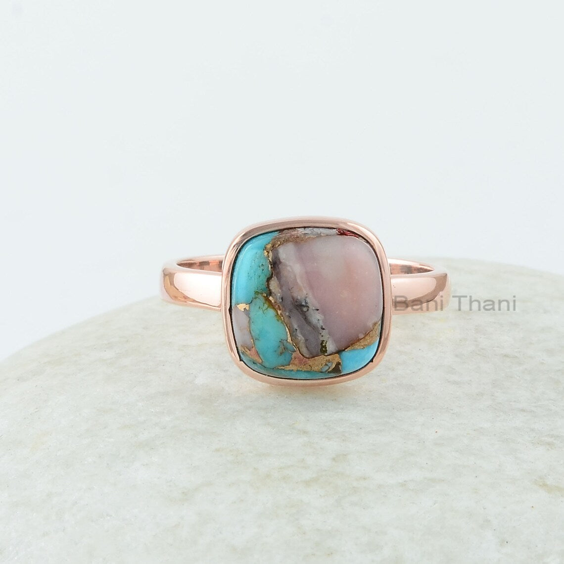 Turquoise Ring - 925 Silver - Pink Opal Copper Turquoise - Cushion Ring - Rose Gold Plated Ring- Sterling Silver Ring, Mojave Turquoise Ring