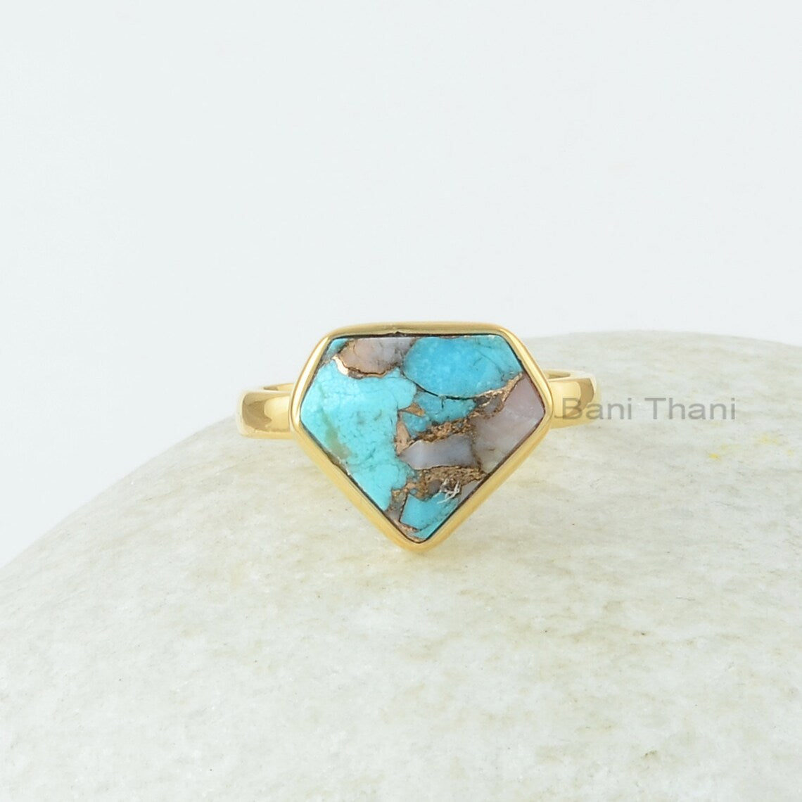 Turquoise Vintage Ring, Pink Opal Copper Turquoise 11x13mm Diamond Shape Gemstone Silver Ring, 18K Gold Plated Ring, Christmas Jewelry Gift