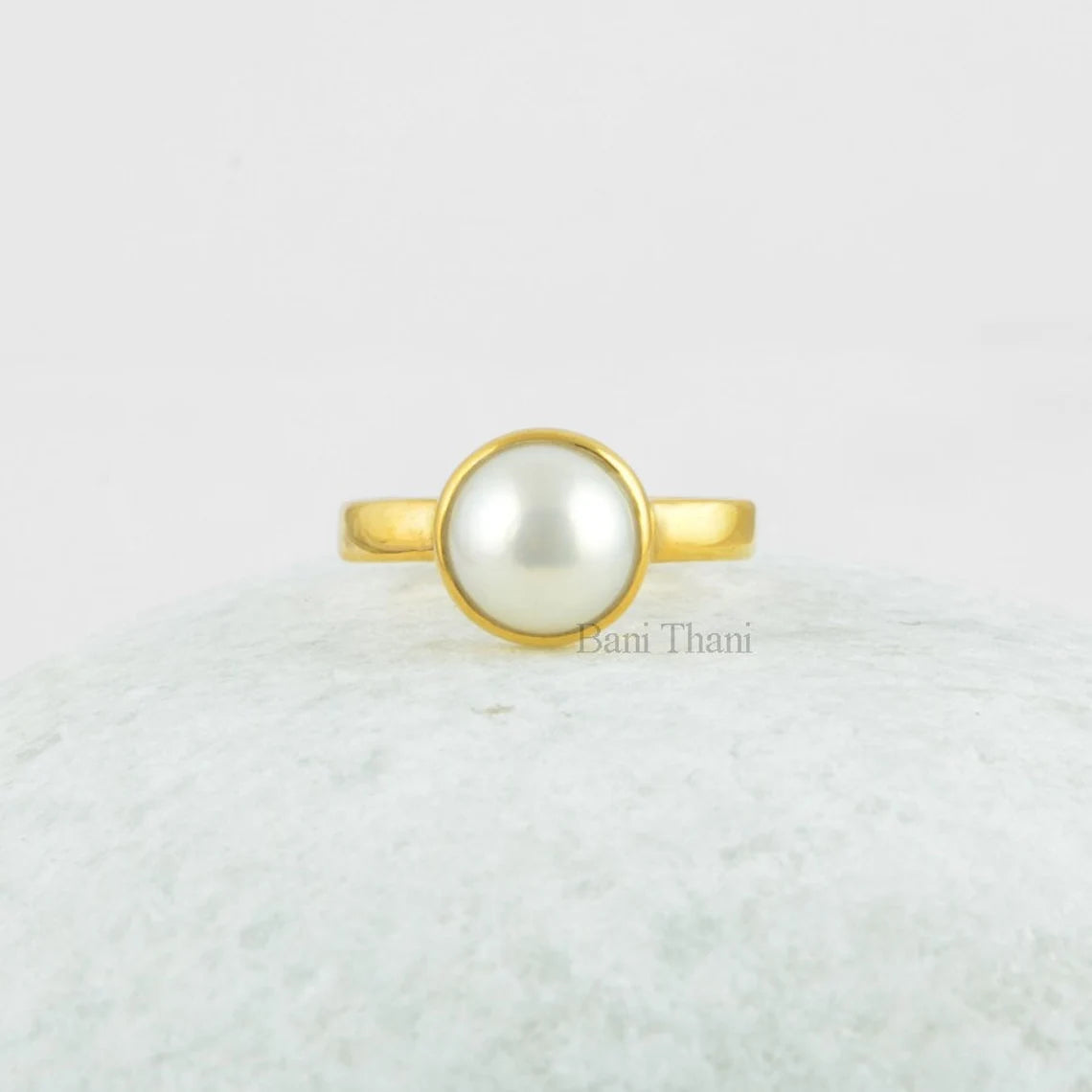 White Freshwater Pearl 8x8mm Round Micron Gold Plated 925 Sterling Silver Ring Jewelry, White Gemstone Ring For Women, Gift For Valentines