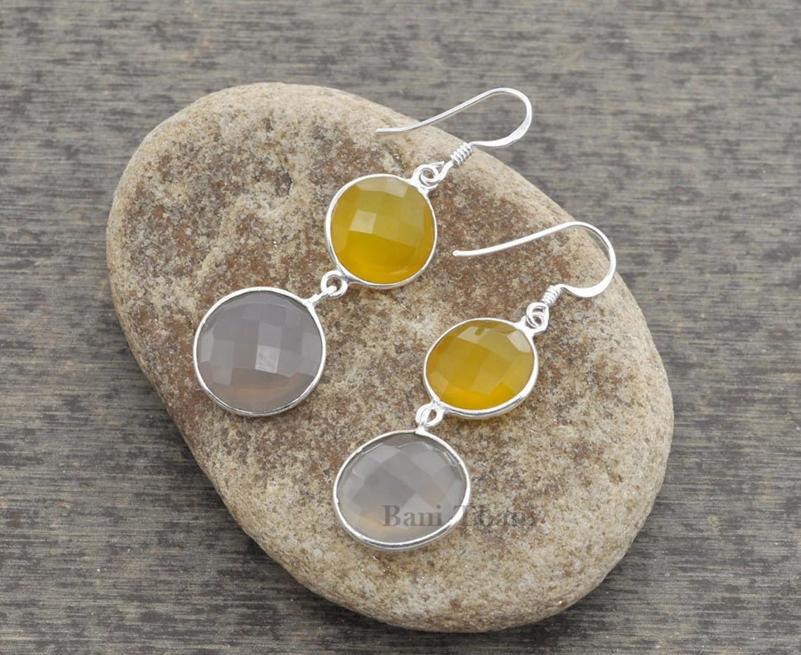 Yellow Chalcedony 12mm and Grey Chalcedony 15mm Round Gemstone Drop Earrings, 925 Sterling Silver Earrings, Hook Earrings, Dangle Earrings